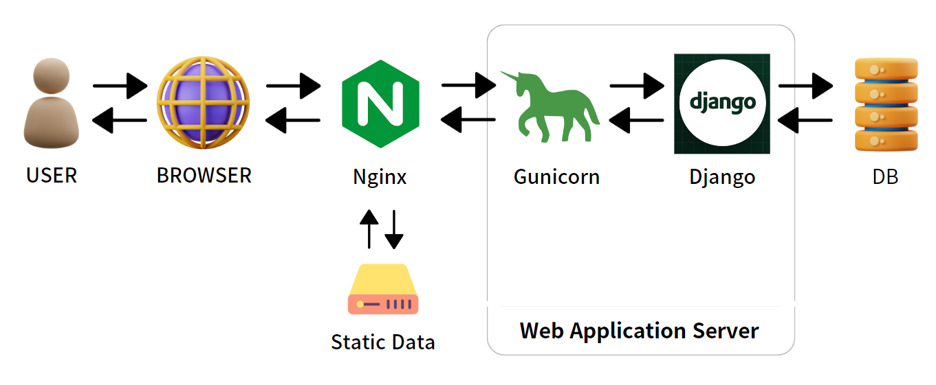 찾아본 바로는 둘을 묶어 WAS로 언급하는 글이 많아, python django 기반의 프로덕션 서버 모식도를 이와 같이 묘사하였습니다.