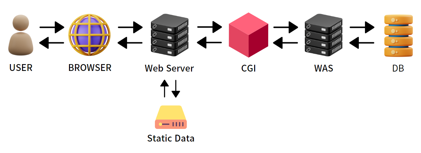 3. 동적 컨텐츠 요청이 있으면, CGI를 통해 WAS로 요청을 보내고, 그에 맞게 WAS는 데이터를 Web Server로 보냅니다.