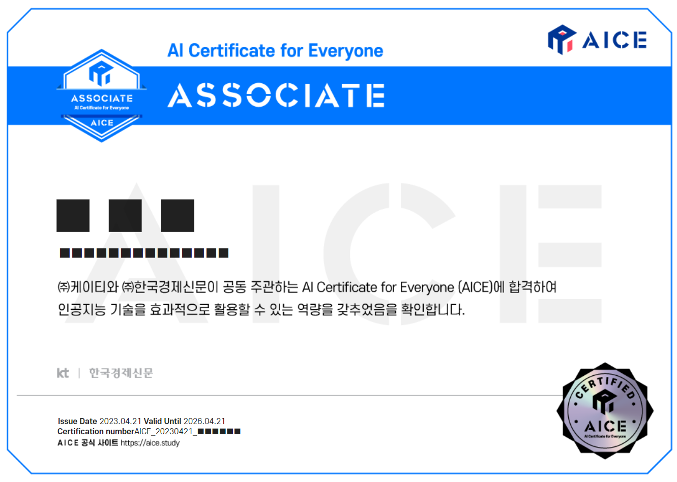 [KT AIVLE 3기] AICE ASSOCIATE 자격 취득 본문